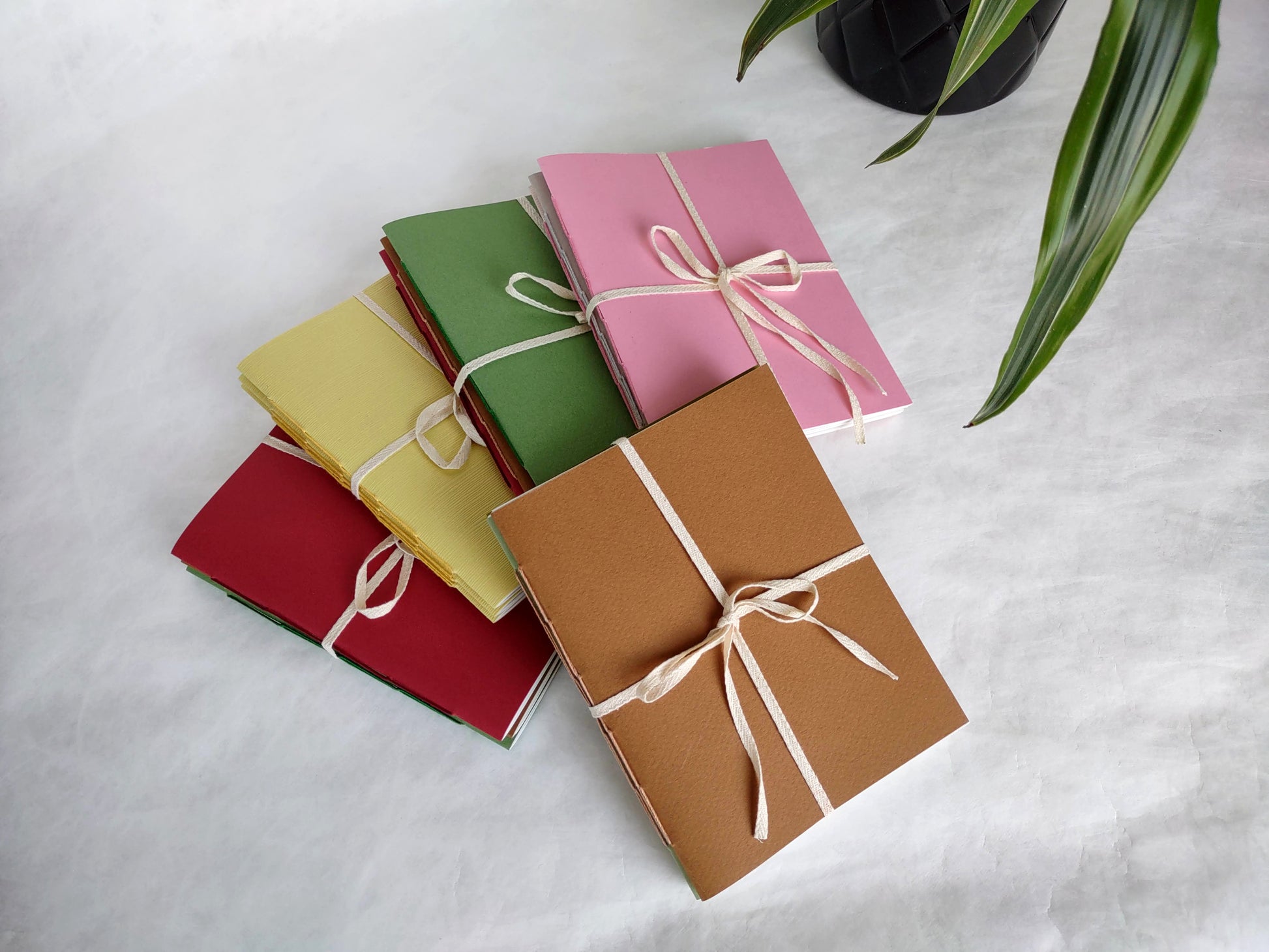 They are is handbound using unwaxed cotton thread in a chain stitch and the set is wrapped together with cotton ribbon.