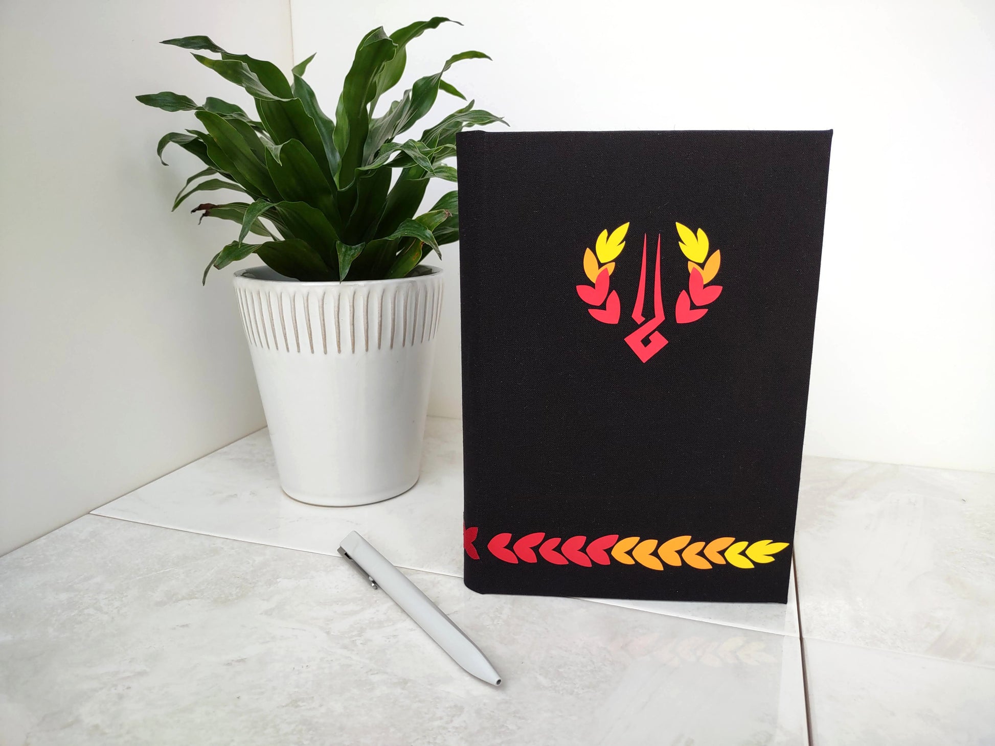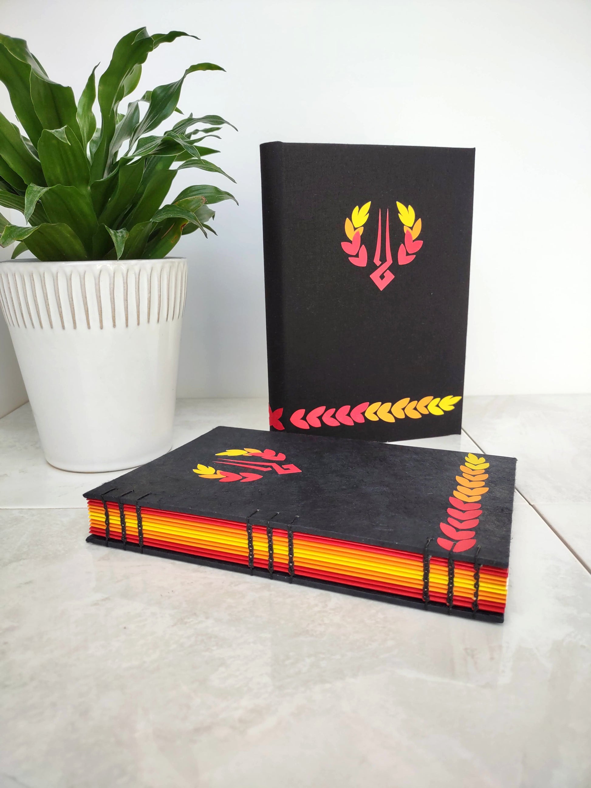 Both journals come with a design from the Supergiant game Hades appliqued on both the front and the back.