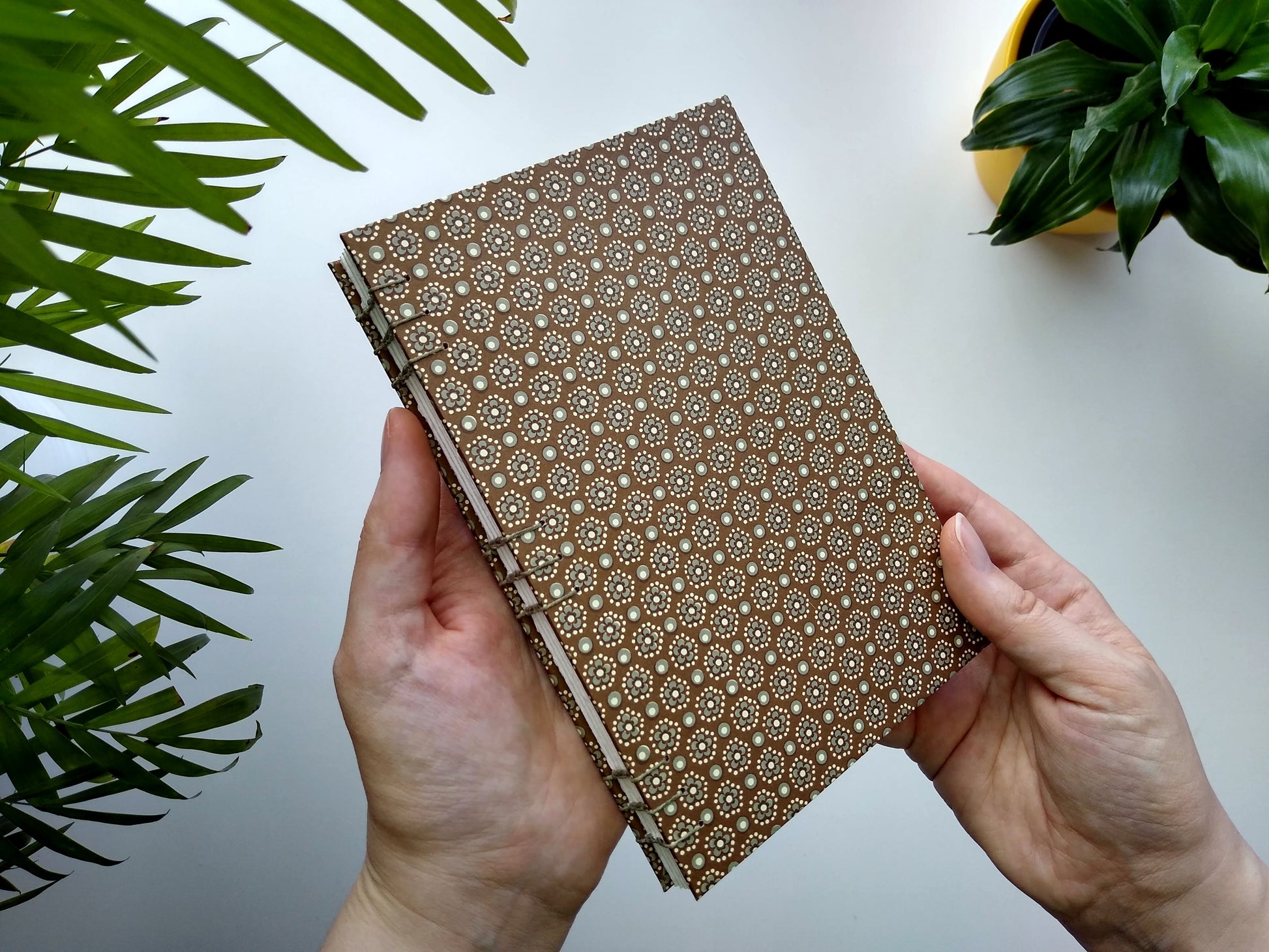 This journal is handbound using waxed olive linen thread in a Coptic stitch. The cover is wrapped in printed Italian paper with a repeating geometric flower motif. The endpapers are made of tan cardstock.