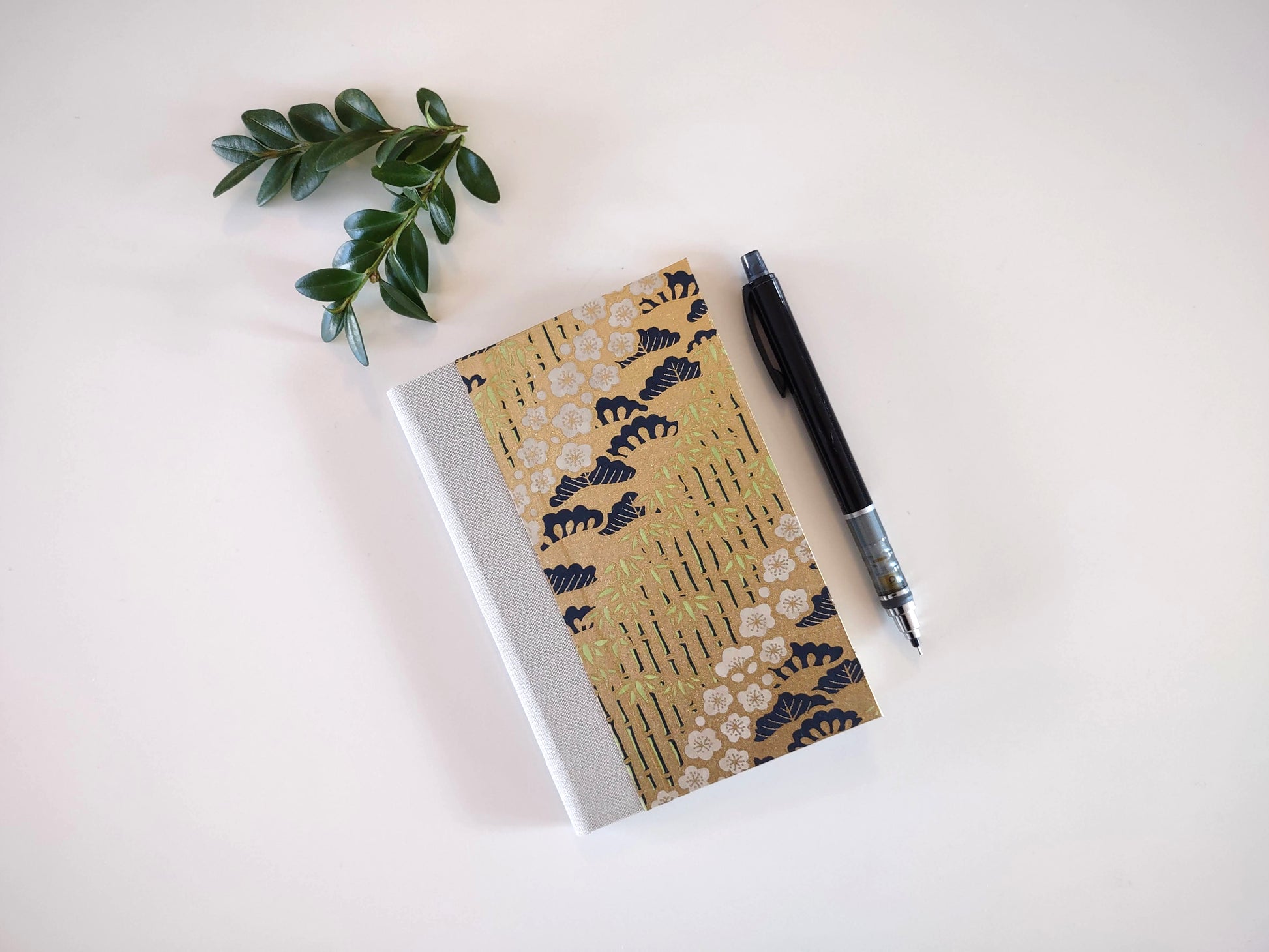 The cover is wrapped in a Chiyogami paper with a gold bamboo motif. The spine is made of a cream Rayon book cloth. It contains 32 sheets / 64 pages of smooth sketch paper. It's printed with room for 320 addresses, along with phone number, birthday, email, and a notes section per person.